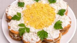 Все составляющие кроме яиц и креветок нарезаются мелко, а их оставляют в качестве украшения, располагающегося по краям тарелки.