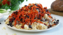 - Редьку очистить и порезать небольшими кусочками, сложить вместе с мясом в кастрюлю и залить кипятком. Варить 15 минут, затем всыпать рис и довести его до готовности.