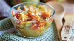 Зваріть картоплю з морквою. Потім усе нарізається дрібними шматочками, заправляється майонезом і приправляється спеціями.